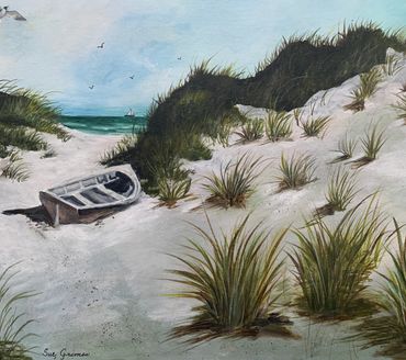 Sue Grimes records peaceful landscapes from mountain scenes to deserts to country sides showing an old cabin or barn. She also enjoys traditional seascapes, along with boats, lighthouses, shorebirds, shells, and other sea life. But Sue also finds inspiration in her kitchen and garden, resulting in several painted series of flowers, fruit, and veggies.